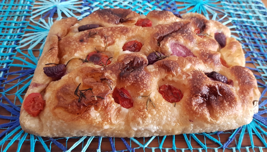 Focaccia: macio e deliciosamente coberto com sal grosso, azeite, azeitona, alecrim e tomatinhos cereja