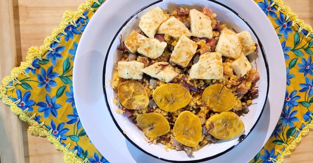 Baião do Borogodó: feijão verde, cuscuz, calabresa, charque, bacon, tomate, cebola, queijo coalho e banana da terra