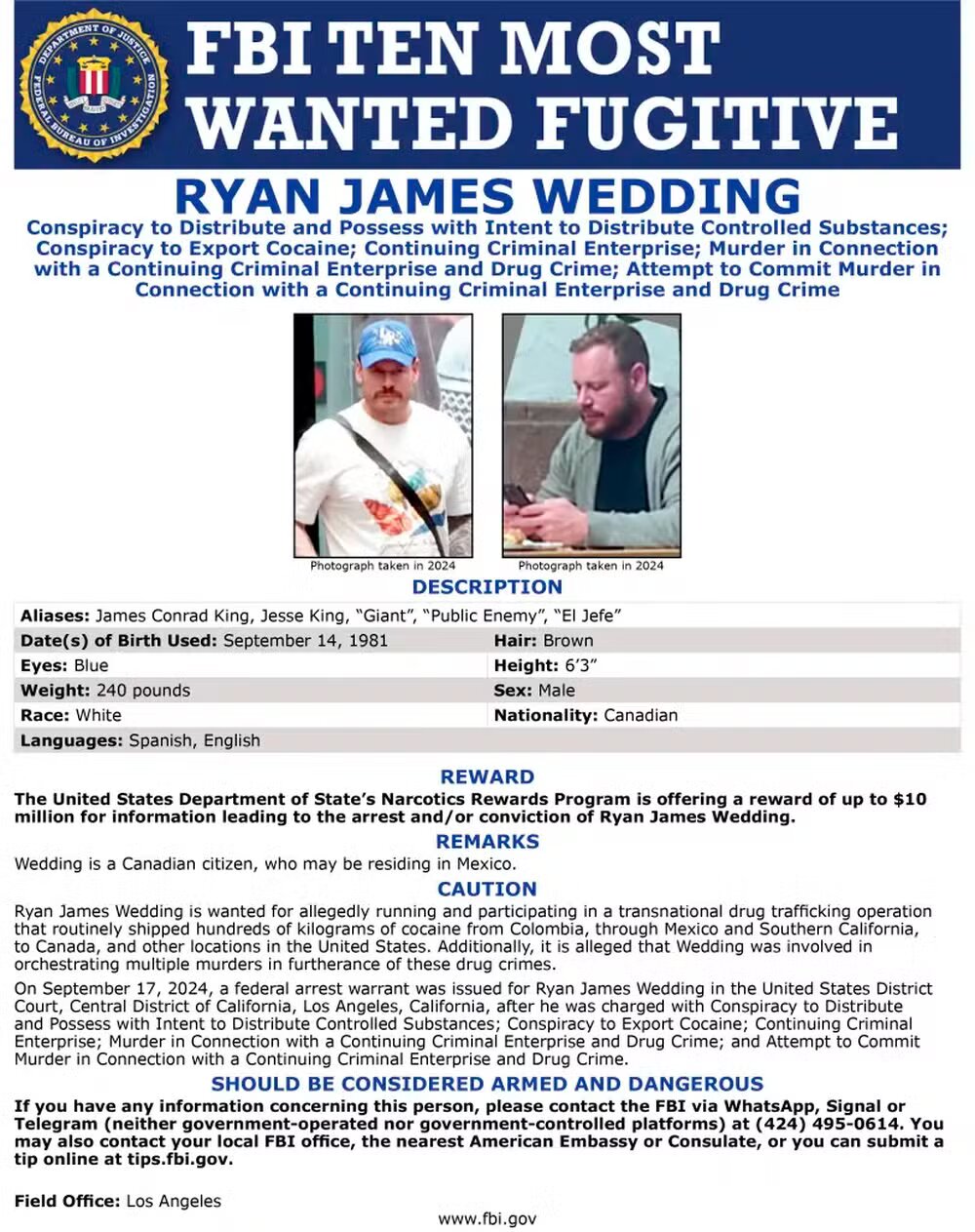 “Os supostos assassinatos de seus concorrentes fazem de Wedding um homem muito perigoso, e sua inclusão na lista dos Dez Fugitivos Mais Procurados, juntamente com uma grande oferta de recompensa pelo Departamento de Estado, tornará o público nosso parceiro para que possamos alcançá-lo antes que ele coloque mais alguém em perigo”, acrescentou Davis.