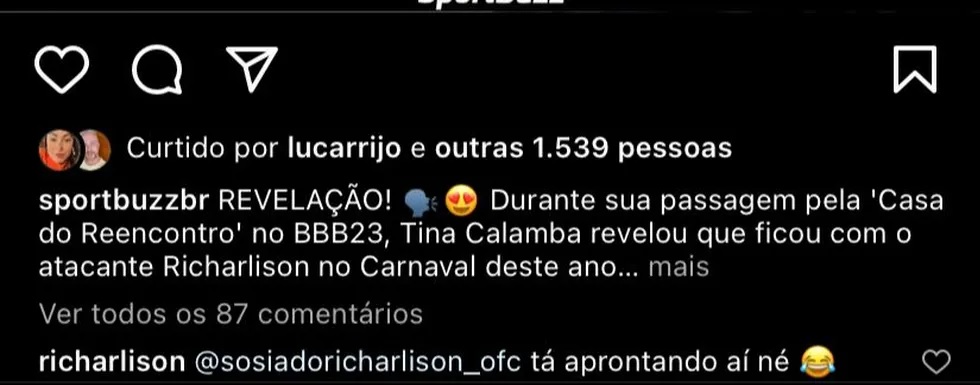 Após Tina com quatro letras ter contado na Casa do Reencontro que ficou com Richarlison no carnaval, fãs do jogador tentam, de todas as formas, juntar as peças dessa história. O problema é que o atacante estava atuando pelo Tottenham, time inglês pelo qual joga, em dois jogos justamente no período da folia. E nesse quebra-cabeças sobrou até para o sósia oficial do jogador. Gaiato que é, ao saber da fofoca com seu nome, Richarlison marcou Mateus Marcelino e escreveu: "Tá aprontando aí, né".