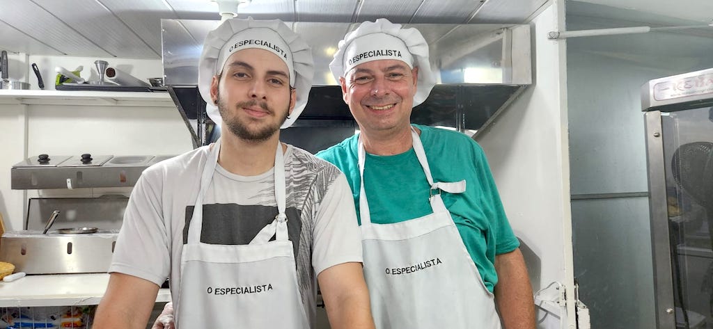 Quem conduz o trailer na Praça do Skate é a família de Claudio Roberto dos Santos, ao lado de sua esposa, Lucia Teles, e do filho, Enzo. “Faço a produção das carnes todos os dias: deixo marinada por 24 horas nas especiarias”, conta o churrasqueiro Cláudio. Um dos segredos do tempero, segundo ele, é a pimenta síria.