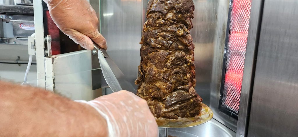 Churrasco Grego: a carne é temperada com especiarias e fica no espeto