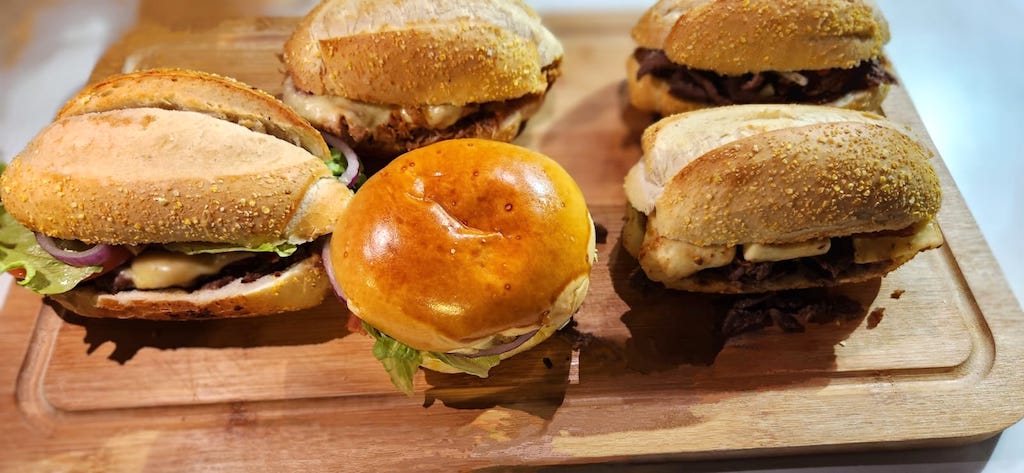 As carnes do churrasco são contra-filé, coxão mole e fraldinha, intercaladas com gorduras, dando mais sabor. A lista dos sanduíches vai do grego ao hambúrguer artesanal. Para incrementar têm os molhos tzatziki (iogurte, pepino e alho), tahine (pasta feito de sementes de gergelim) e maioneses (alho, verde, casa e de bacon).