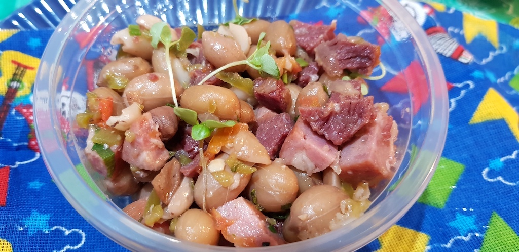 O amendoim cozido virou tropeiro com linguiça defumada, charque e temperos, outra maravilha do combo junino.