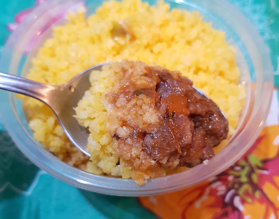 O tradicional cuscuz veio na textura de farofa e recebeu ragu de linguiça temperado na manteiga, vinho tinto e molho de tomate. Nordeste com sabor italiano.