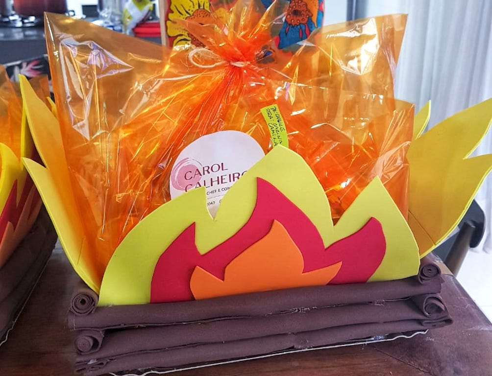 A chef Carol Calheiros caprichou em sua cesta junina. Com design de uma fogueira e cheia de sabores nordestinos, ela ainda dá direito a uma máscara de chita. A alagoana não economizou na criatividade e nem na gostosura. Ficou até difícil escolher a estrela da fogueira junina. Tem quiche de carne de sol com queijo e banana da terra, amendoim com charque, cuscuz com ragu de linguiça, queijadinha com goiabada e uma palha italiana de amendoim, simplesmente, inesquecível.