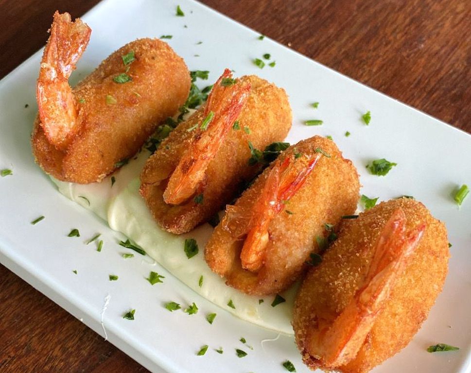 Coconut: Camarão Coconut – Quatro camarões (filé), recheado com requeijão, empanado com massa especial. Servido sobre uma cama de creme de parmesão. Av. Dr. Antônio Gouveia, 15 – Pajuçara