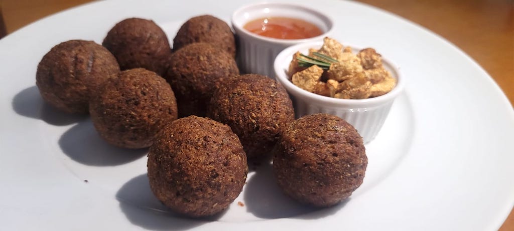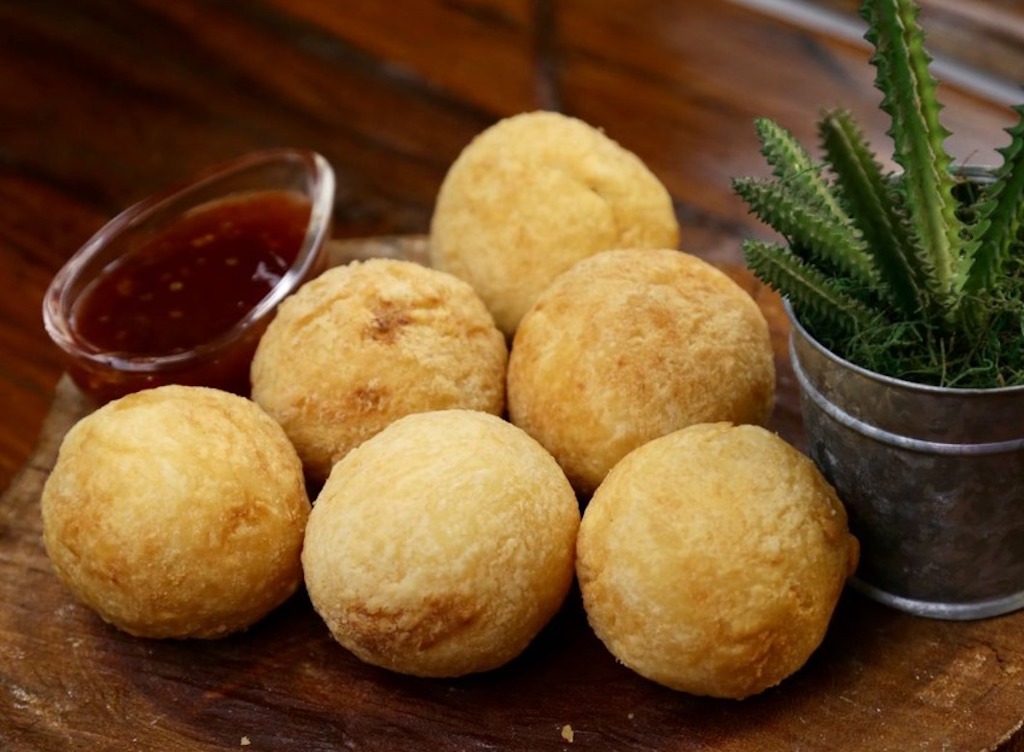 Boteco da Bola: Bolinho de feijoada recheado com bacon e couve. Acompanhado de molho de pimenta e torresminho. Profa. Maria Esther da Costa Barros, 306 – Jatiúca