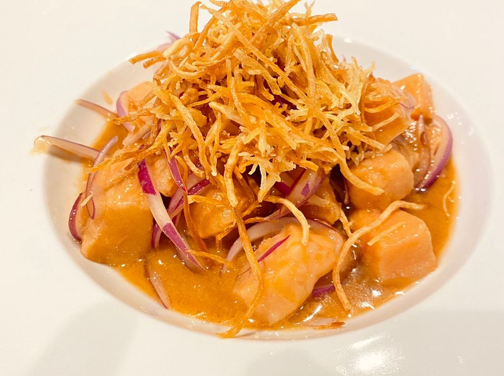 Lopana: Ceviche de Salmão ao molho de maracujá e crispy de batata doce. Av. Silvio Carlos Viana, 27 – Ponta Verde