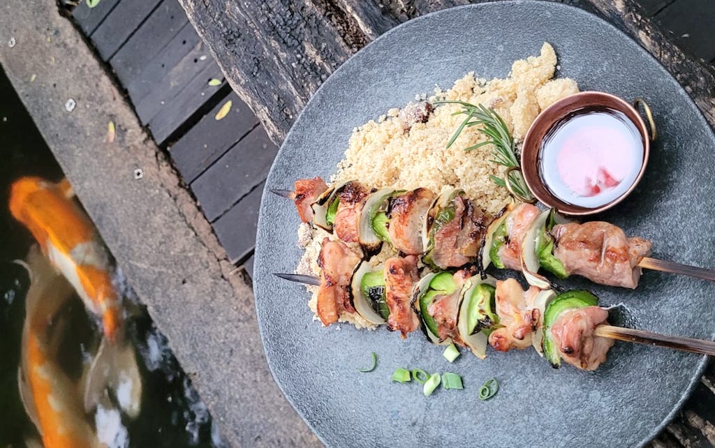 Divina Gula: Duo de Espetinhos (Frango e Picanha Suína). Acompanhado de farofa de abacaxi com bacon e geleia de pimenta. Av. Eng. Paulo Brandão Nogueira, 85 – Jatiúca