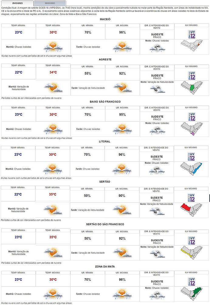 A temperatura na capital alagoana deve variar entre 23ºC e 30ºC, sendo essa a temperatura máxima. Confira, abaixo, a previsão em todas as regiões de Alagoas.
