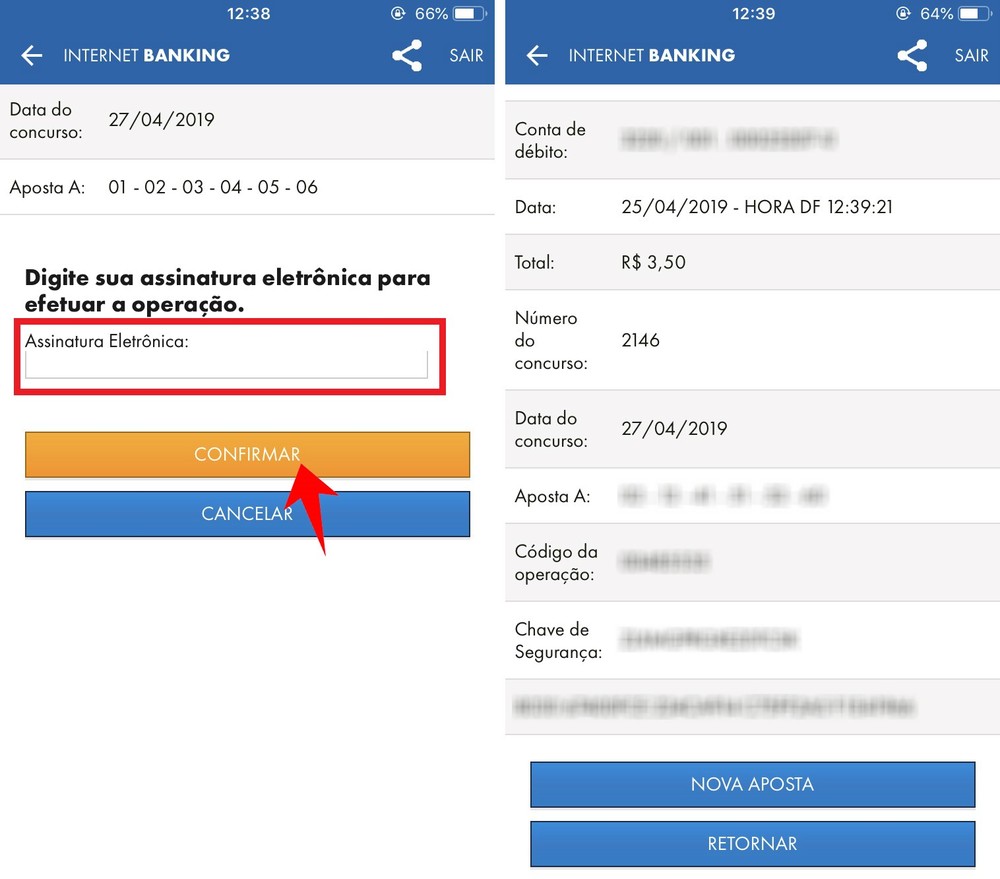 Passo 4. Confira sua aposta, digite a senha do seu Internet Banking da Caixa e finalize em "Confirmar". Veja na tela o comprovante da sua aposta.