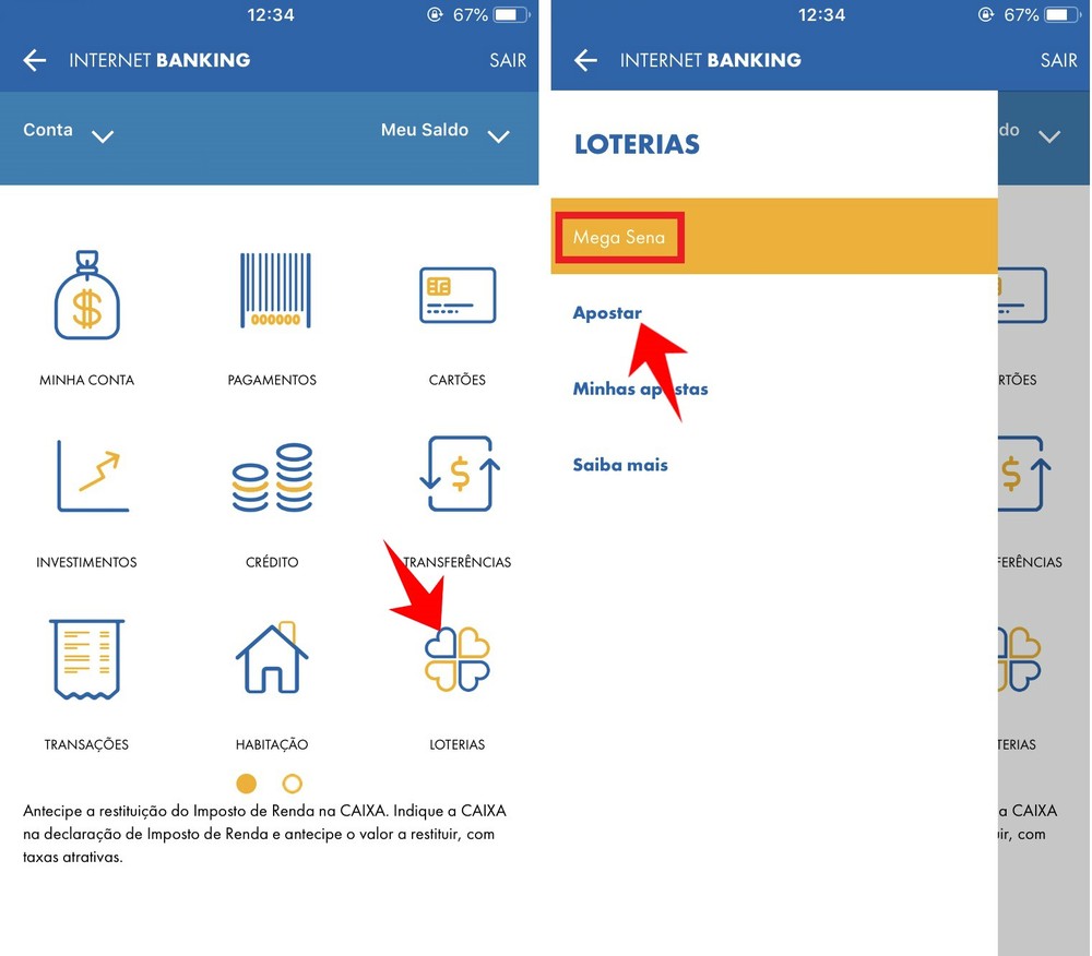 Passo 1. Abra o aplicativo da Caixa e selecione a opção "Loterias". Depois, clique em "Mega Sena" e "Apostar";