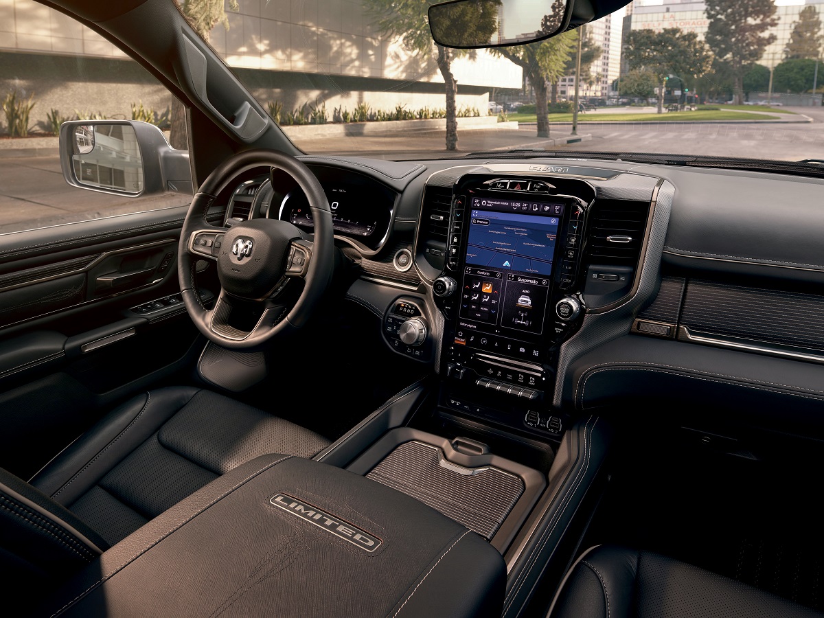 Esse item é mais uma das exclusividades da Ram 1500, bem como o espelho retrovisor interno digital, que oferece a melhor visibilidade traseira possível em qualquer situação, mesmo que a cabine e a caçamba estejam cheias. Outro ponto alto é a central multimídia Uconnect de 12” com Apple Carplay e Android Auto sem fio e navegação embarcada, de onde se pode comandar o som premium Harman Kardon® com 19 alto-falantes e 900 watts de potência.