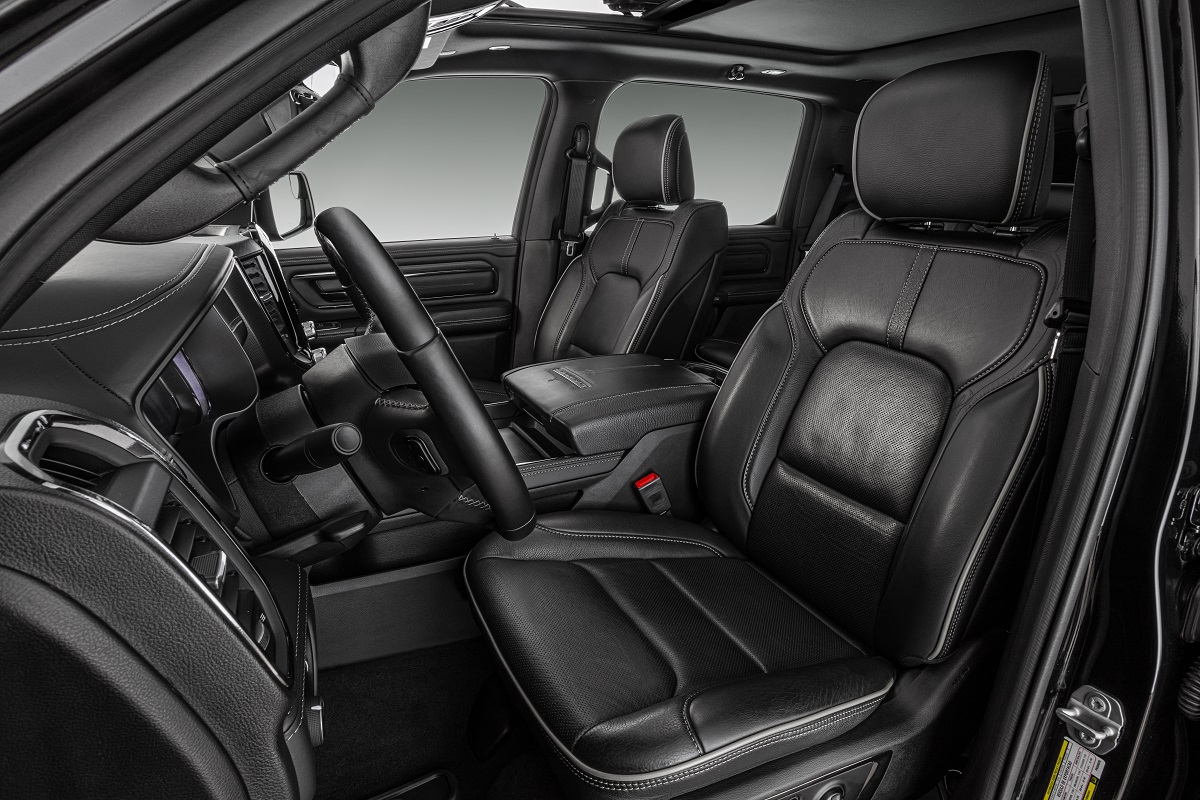 A Ram 1500 Limited é a única picape a oferecer bancos traseiros reclináveis em até 8°, proporcionando ainda mais conforto aos passageiros. Até o apoia-braços é premium, sendo quase tão largo quanto o dianteiro e englobando um porta-objetos e dois porta-copos. Vale mencionar o assoalho traseiro plano, que não compromete o espaço para quem vai no assento central e é protegido com sobretapetes premium, em borracha e tecido, com bordas elevadas.