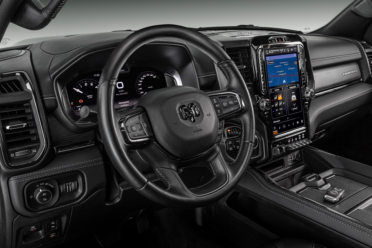 O sistema inclui o exclusivo recurso de cancelamento ativos de ruídos externos. Para fechar o pacote tecnológico da 1500 Limited, temos visão 360° com quatro câmeras, carregamento por indução, freio de estacionamento elétrico, sensores crepuscular e de chuva e o sistema Keyless Enter ‘N Go com partida remota. Regulável em altura e profundidade e com aquecimento, o volante reúne comandos de assistência à direção, áudio, quadro de instrumentos e limitador da marcha mais alta, recurso muito útil para uma descida de serra ou situação de reboque.