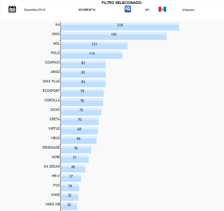 Em dezembro mais uma vez o carro mais vendido do estado foi o Ford Ka com 218 unidades emplacadas. O Chevrolet Onix terminou dezembro na vice-liderança com 195 unidades, 23 veículos a menos que o Ka.