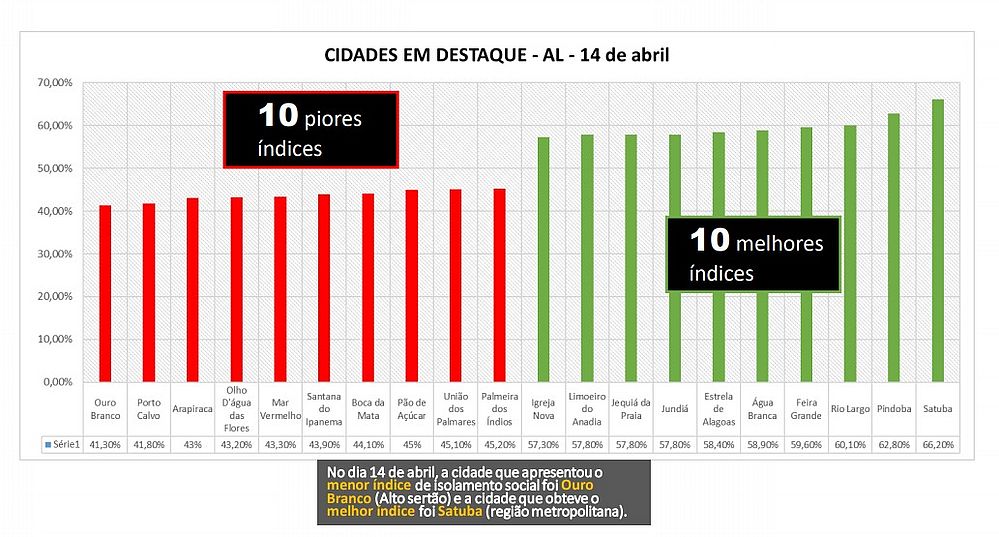 Os dados apurados no dia 14 de abril revelarm que o município de Satuba, na região metropolitana de Maceió, teve o melhor indicativo, com 66,2% de isolamento. A cidade alagoana que menos respeitou a orientação dos órgãos de saúde foi Ouro Branco, no Alto Sertão, com apenas 41,3% de pessoas.
