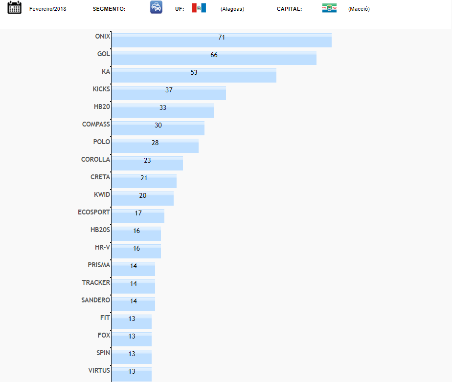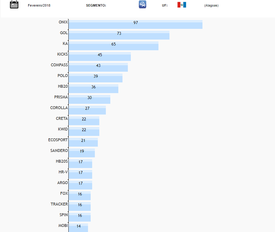Na liderança segue o GM Onix com 97 veículos vendidos no estado. Em janeiro o Onix liderou com 220 emplacamentos, mais que o dobro do volume de fevereiro. Ao contrário do ranking nacional, o vice-líder em Alagoas foi o VW Gol com 73 veículos emplacados, seguido pelo Ford Ka com 65, Nissan Kicks com 45 e Jeep Compass com 43, fechando o top 5.