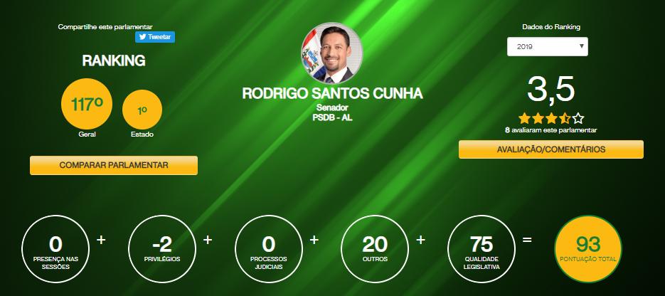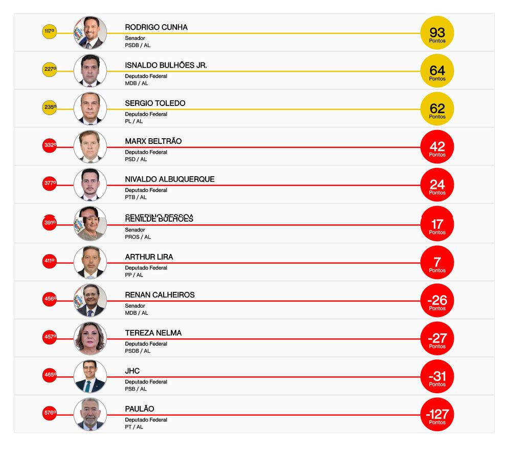 Ranking Nacional - Esses e outros pontos negativos na ficha do deputado o deixou na 11ª posição no ranking da bancada alagoana, que só tem 12 parlamentares. No ranking nacional, que soma 594 parlamentares, o alagoano figura na posição 465.