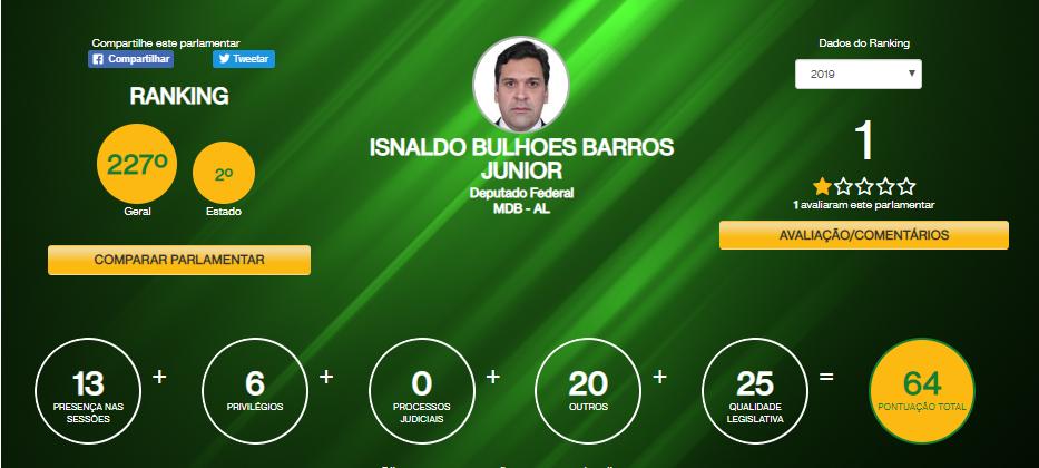 Isnaldo Bulhões (MDB) aparece no segundo lugar no ranking alagoano. O deputado conseguiu 64 pontos com quesitos como assiduidade. Bulhões não faltou a nenhuma das 59 sessões.