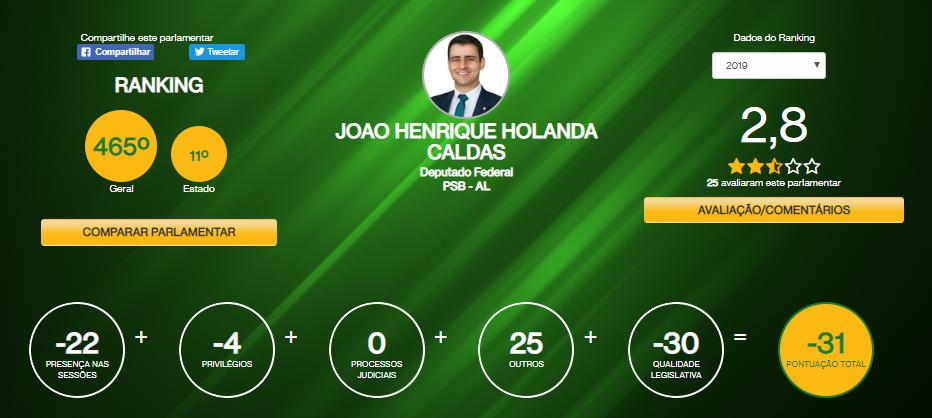 João Henrique Caldas, segundo o levantamento, é o parlamentar mais faltoso. Pesa nesse quesito não apenas o número de ausências, mas a falta de explicações. O deputado não justificou 8 das 10 faltas ao plenário, o que lhe rendeu 22 pontos a menos no ranking.