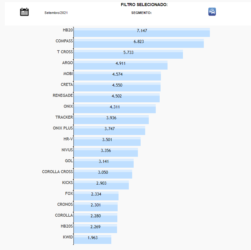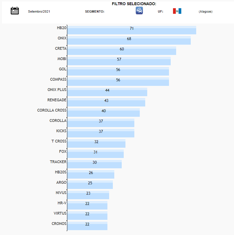 O HB20 emplacou 71 unidades e o Onix 68. Na 3ª posição ficou o Hyundai Creta, líder entre os SUVs com 60 unidades emplacadas, muitas delas ainda na geração anterior, ano 2021.