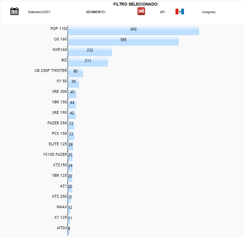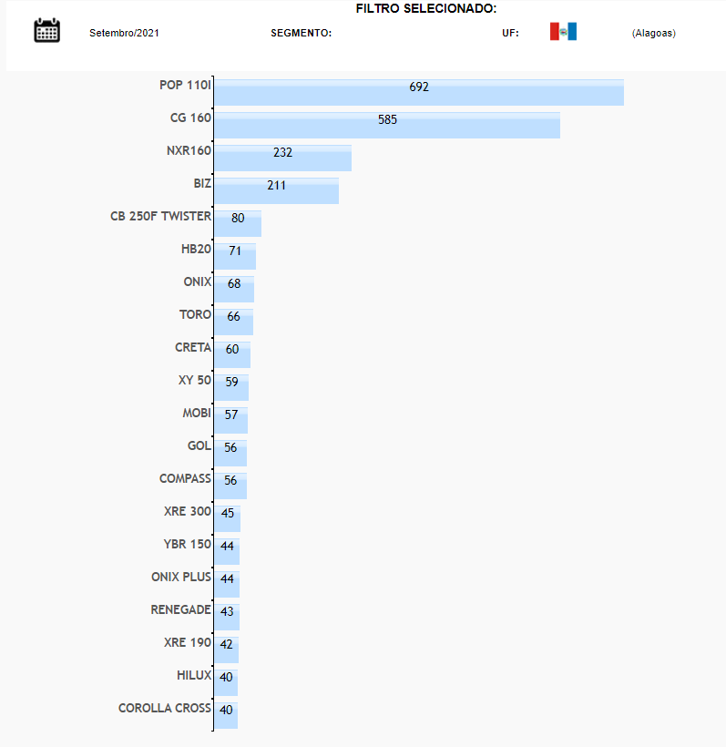Considerando todos os emplacamentos, em setembro o veículo mais vendido em Alagoas foi novamente a moto Honda Pop 110i. Ao todo foram 692 unidades emplacadas no mês.