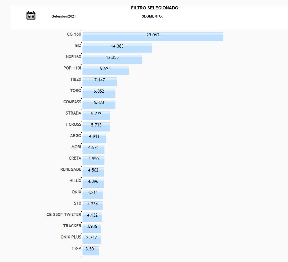Confira o Top 20 dos mais emplacados em Alagoas em setembro segundo a FENABRAVE: