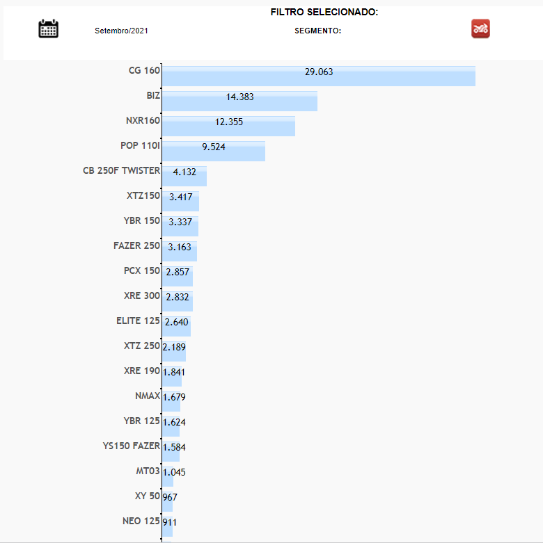 Os outros 4 veículos mais emplacados no estado também foram motocicletas, sendo 3 da Honda e 1 da Yamaha. O primeiro carro na lista foi o Hyundai HB20 com 71 unidades vendidas, 3 a menos que o Chevrolet Onix que após quase 7 meses voltou às concessionárias.
