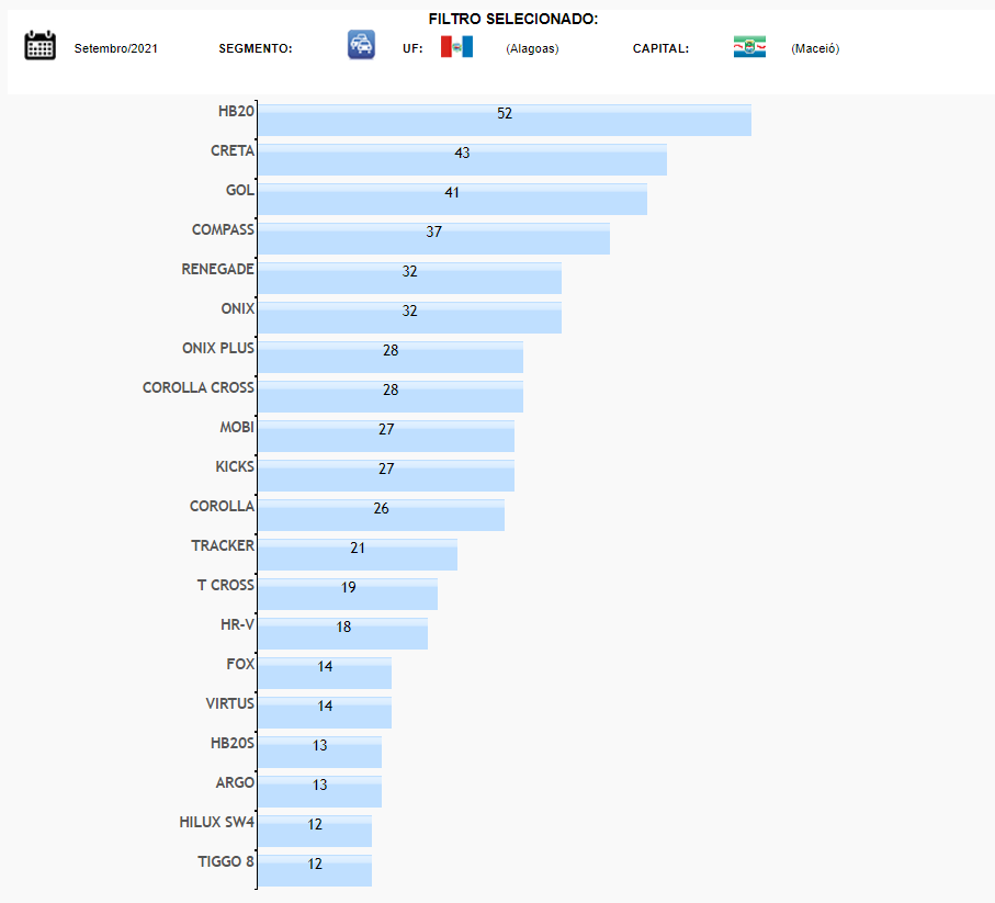 Olhando para os números da capital, a Hyundai liderou com folga com HB20 com 52 veículos emplacados e Creta com 43.
