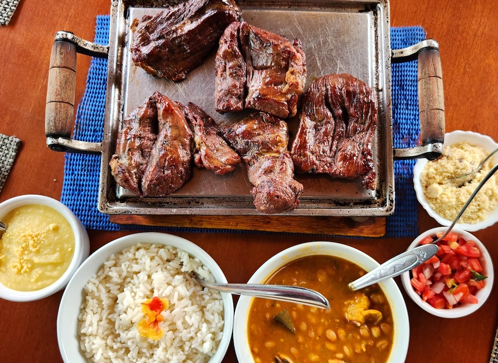 Se você chegar no horário do almoço, reserve o espaço para a sobremesa, porque o carneirinho assado com feijão caseiro, arroz, farofa e purê de macaxeira (perfeito) tudo para compartilhar, afinal, além do sorvete de rapadura, tem o ouricuri e murici, meus prediletos.