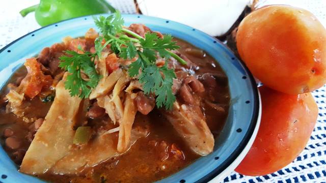 Cozinhe o feijão (1/2kg). Coloque coentro, pimentão, pimenta do reino, colorau, vinagre, leite de coco e cebolinha. Deixe engrossar. Machuque um pouco de feijão e adicione o bacalhau para cozinhar.