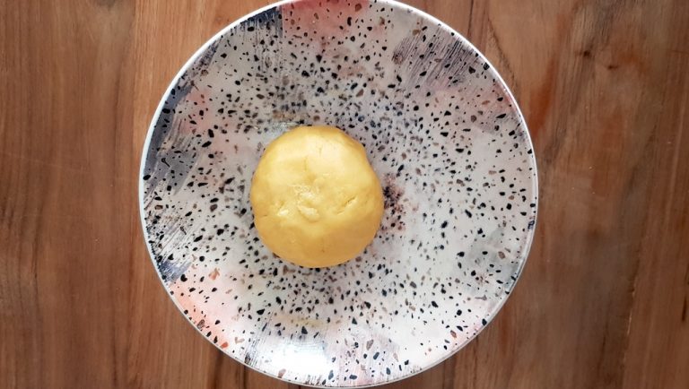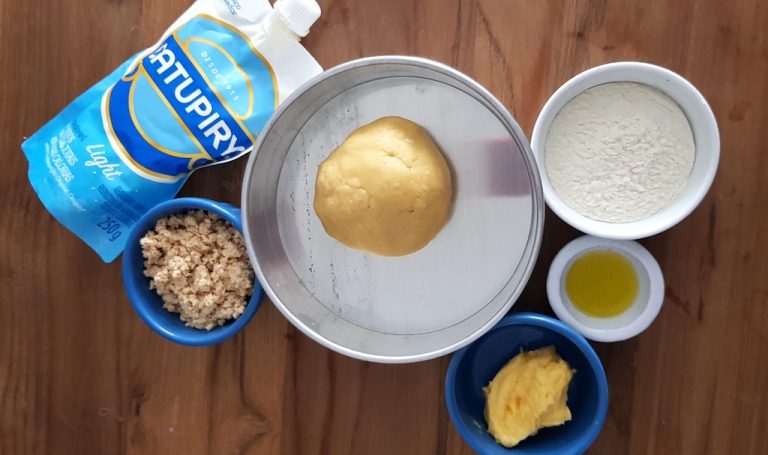 Misture uma xicara de farinha com manteiga, amasse com as mãos e, aos poucos, acrescente o azeite até a massa ficar lisa e forme uma bola. Divida a massa ao meio. Abra um plástico, coloque a massa e com o rodo estire a massa.