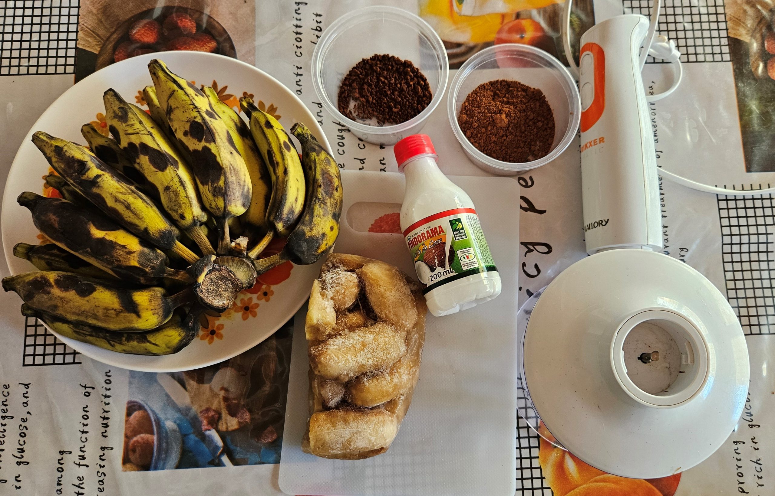 Tem várias receitas com banana na internet. Foi assim que encontrei a do sorvete da fruta com café solúvel e cacau 100%, com zero de açúcar e de lactose. Apenas acrescentei leite de coco Pindorama. Testei, gostei e compartilho com vocês. Agora, a banana prata precisa ser bem madura, daquelas que fica com pontinhos pretos, ou aquela que amadurece tanto que a gente pensa em jogar fora. Então, congele e vamos para receita.