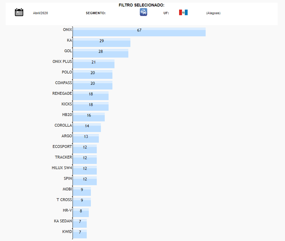 O líder em Alagoas foi o Chevrolet Onix com 67 unidades emplacadas. O Ford Ka que sempre briga pela liderança, em abril vendeu apenas 29 carros.