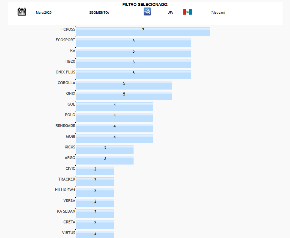 O VW T-Cross é o líder parcial de vendas no estado com 7 unidades emplacadas. O Ford Ecosport está em segundo com 6, empatado com Ford Ka, Hyundai HB20 e Onix Plus, todos também com 6. Impressionante é que a soma dos 20 primeiros mais emplacados chega a apenas 77 veículos.
