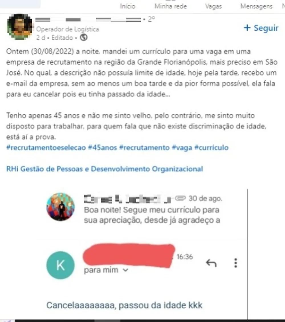 A resposta de uma recrutadora em um e-mail enviado a um candidato que manifestou interesse por uma vaga de emprego na Grande Florianópolis viralizou no LinkedIn na quarta-feira (1º). Segundo a publicação de Carlos Augusto Luchetti Junior, de 45 anos, após enviar o currículo se candidatando a uma vaga sem limite de idade, recebeu como resposta: "Cancelaaaaaaaa, passou da idade [sic]".