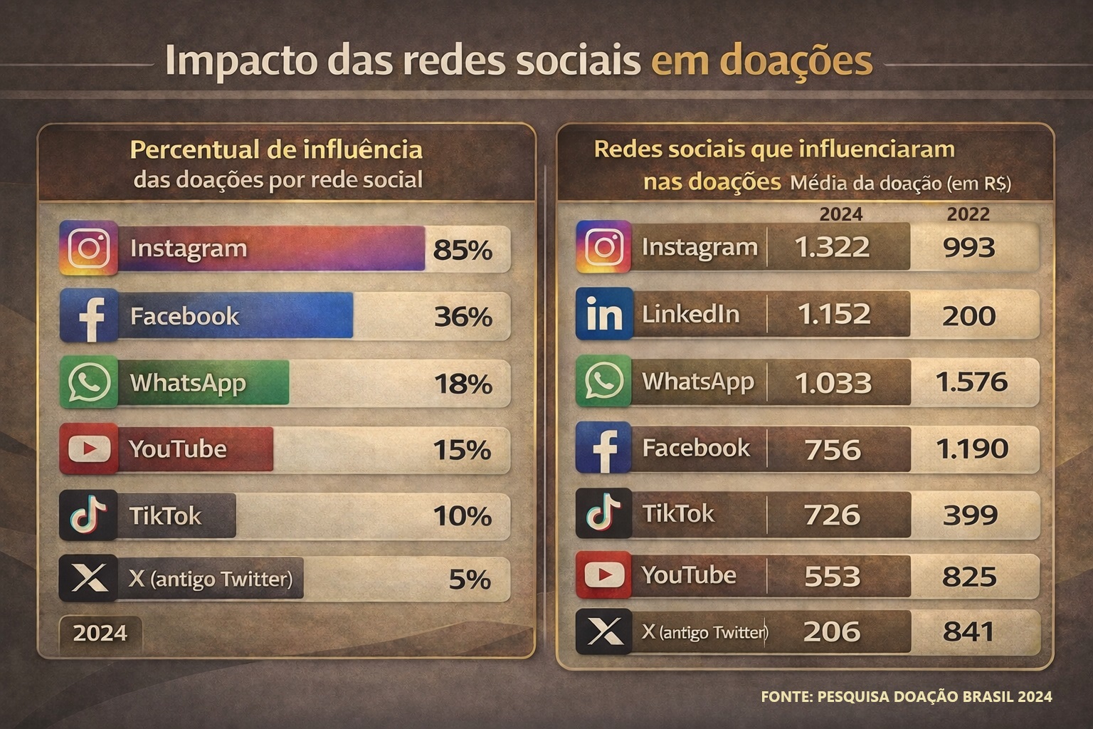 Outro ponto relevante do levantamento é que, além de influenciar mais, o Instagram também apresenta os maiores valores médios doados entre as redes: R$ 1.322 em 2024. A cifra supera o Whatsapp, que ocupava a primeira posição em 2022.