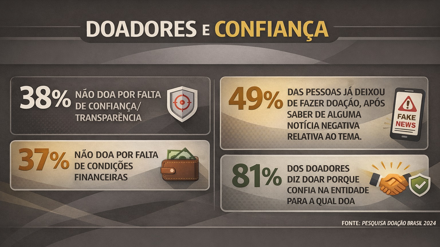 Outro dado central da pesquisa é a mudança no processo de decisão do brasileiro ao doar. O impulso emocional perdeu espaço para uma postura mais crítica e informada: 86% dos doadores afirmam escolher a causa com cuidado e 83% dizem buscar informações antes de contribuir, um avanço significativo em relação a edições anteriores do estudo do IDIS. A confiança passou a ser elemento-chave. Quase metade dos doadores (49%) já deixou de doar após notícias negativas sobre organizações ou campanhas.