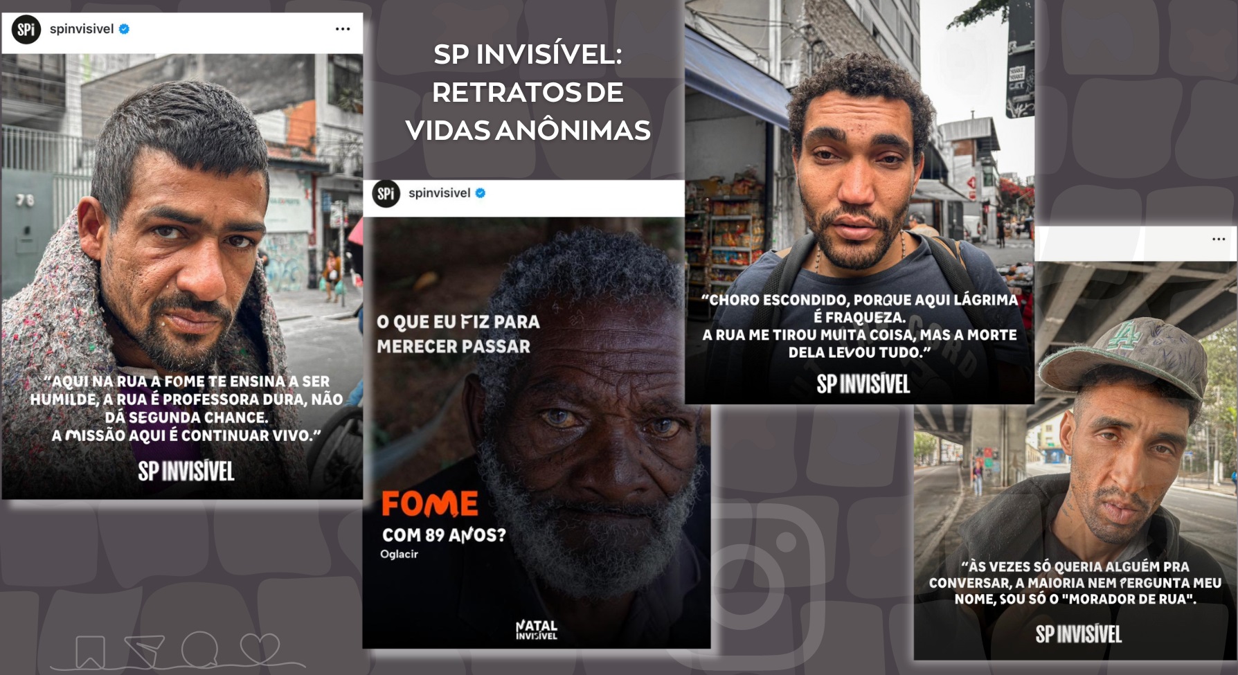 O feed da SP Invisível traz histórias como a de Júlio, de 29 anos, que há 10 anos vive nas ruas. “Carrego muito barulho dentro de mim, não consigo silenciar. Choro escondido, porque aqui lágrima é fraqueza”, diz o jovem que segue tentando sobreviver à perda da mãe.
