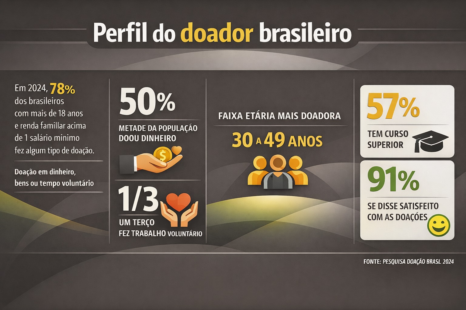 “Vimos um amadurecimento da cultura de doação. Segundo o estudo, o total estimado de doações institucionais chegou a R$ 24,3 bilhões, o maior da série histórica, impulsionado pelo aumento dos valores doados e pelo crescimento da incidência de doadores institucionais, ou seja, que contribuíram com valores em dinheiro para ONGs, campanhas, ou grupos organizados, que passou de 36% (2022) para 43% (2024)”, avalia.