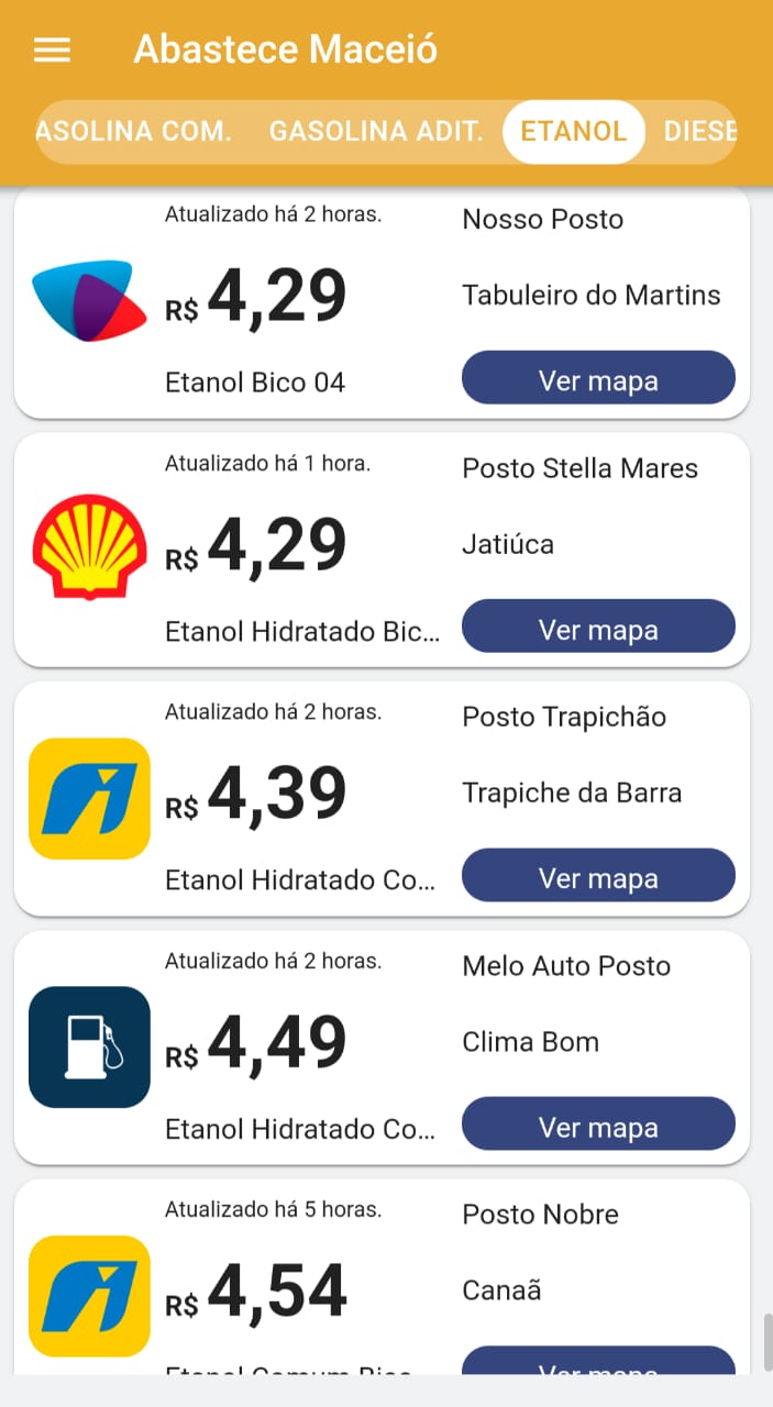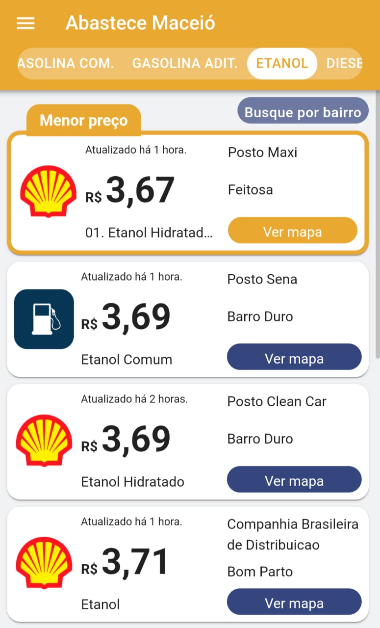 Já o valor do litro do Etanol, que também voltará a ter imposto federal cobrado, estava sendo comercializado a partir de R$ 3,67 em um posto no Feitosa e chegava a R$ 4,54 em um posto no Canaã, veja: