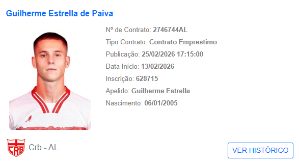 Reforço do CRB para a sequência da temporada, Guilherme Estrella apareceu nesta quarta-feira (25) no Boletim Informativo Diário (BID) da Confederação Brasileira de Futebol (CBF).