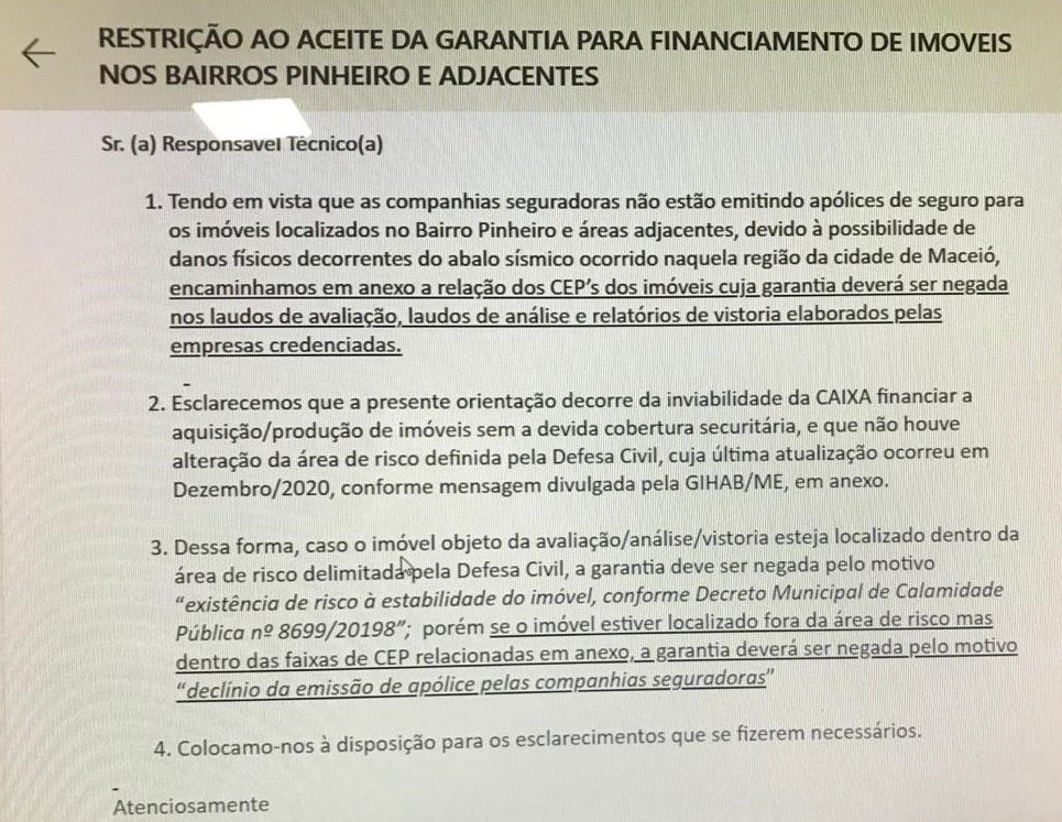 Os arquivos aos quais o TNH1 teve acesso e já circulam na internet incluem uma reprodução de um e-mail da própria Caixa aos responsáveis técnicos de contratos de financiamento enviando a lista de Ceps e explicando que, como as companhias seguradoras não estão emitindo apólice no bairro Pinheiro e áreas adjacentes devido à possibilidade de danos físicos decorrentes do abalo sísmico, a garantia deverá ser negada não só para os imóveis dos bairros que já estão nas áreas de risco, como também para os demais bairros da lista porque as seguradoras estariam se recusando a emitir apólices. Veja abaixo: