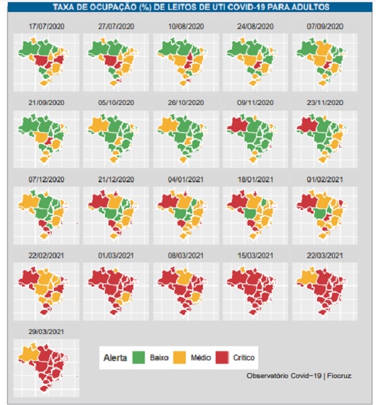 De acordo com a Fiocruz, apenas dois estados e suas respectivas capitais aparecem na zona de alerta intermediário de leitos de UTI Covid-19 para adultos - Amazonas, com 76%, e Roraima com 62%. Todos os demais estados e o Distrito Federal permanecem na zona de alerta crítico, com taxas de ocupação superiores a 80%.