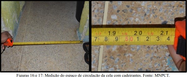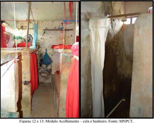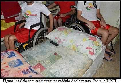 Acessibilidade - Outro ponto que chamaou atenção no relatório foi a situação de reeducando cadeirantes que estão no Módulo Acolhimento do Baldomero Cavalcanti. "Considerando a superlotação da cela onde estão alojados, as pessoas que dormem no chão acabam atrapalhando a circulação dos cadeirantes que precisam transitar com suas cadeiras, dentro da cela, quando precisam ir ao banheiro. Alguns cadeirantes afirmaram já ter se acidentado em razão da falta de adaptação estrutural para suas necessidades. Também não há nenhum tipo de acessibilidade para essas pessoas usarem o banheiro com suas cadeiras de rodas, muito menos autonomia para fazerem suas necessidades fisiológicas no local. O vaso sanitário é revestido de concreto, dificultando que essa pessoa possa sentar-se. A descarga do vaso sanitário e o registro do chuveiro estão localizados numa posição que não permite o acesso por essas pessoas".