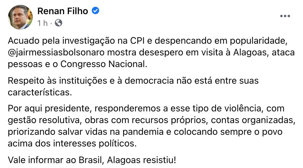 Em seguida, Renan Filho também usou as redes sociais para contra-atacar. O governador, que não participou da visita de Bolsonaro ao estado, disse que o presidente ataca por estar "acuado pela investigação na CPI. "Acuado pela investigação na CPI e despencando em popularidade, mostra desespero em visita a Alagoas, ataca pessoas e o Congresso Nacional.Respeito às instituições e à democracia não está entre suas características".