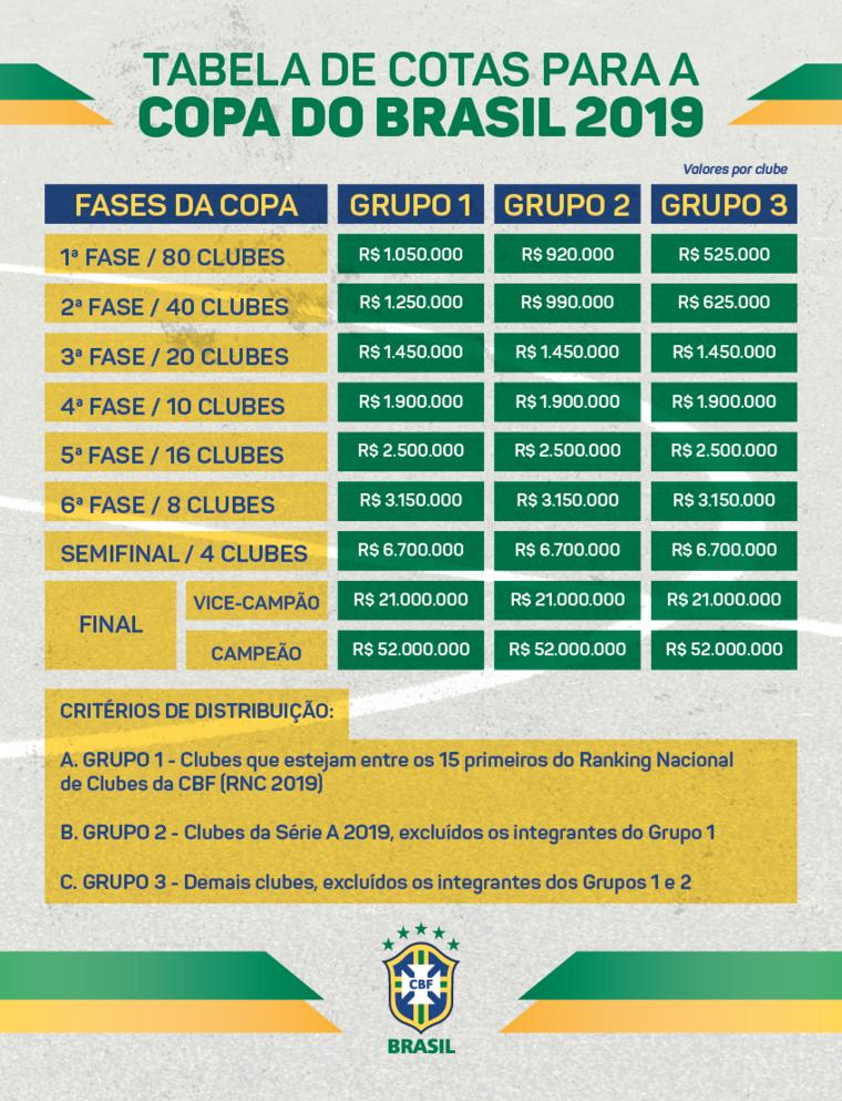 CRB e Brasiliense estão no Grupo 3 e recebem R$ 525 mil pela primeira fase da Copa do Brasil. Quem se classificar garante mais R$ 625 mil. Da terceira fase em diante, os valores são iguais para os três grupos.