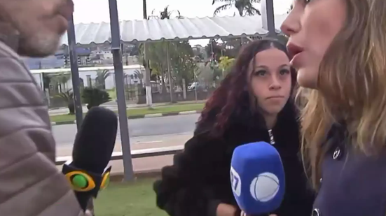 Lucas tentava falar com familiares das adolescentes quando Grace entrou na frente dele. "Dá licença, Grace, tá louca?", disse ele ao empurrar a colega em uma cena que foi exibida ao vivo pelo Brasil Urgente.